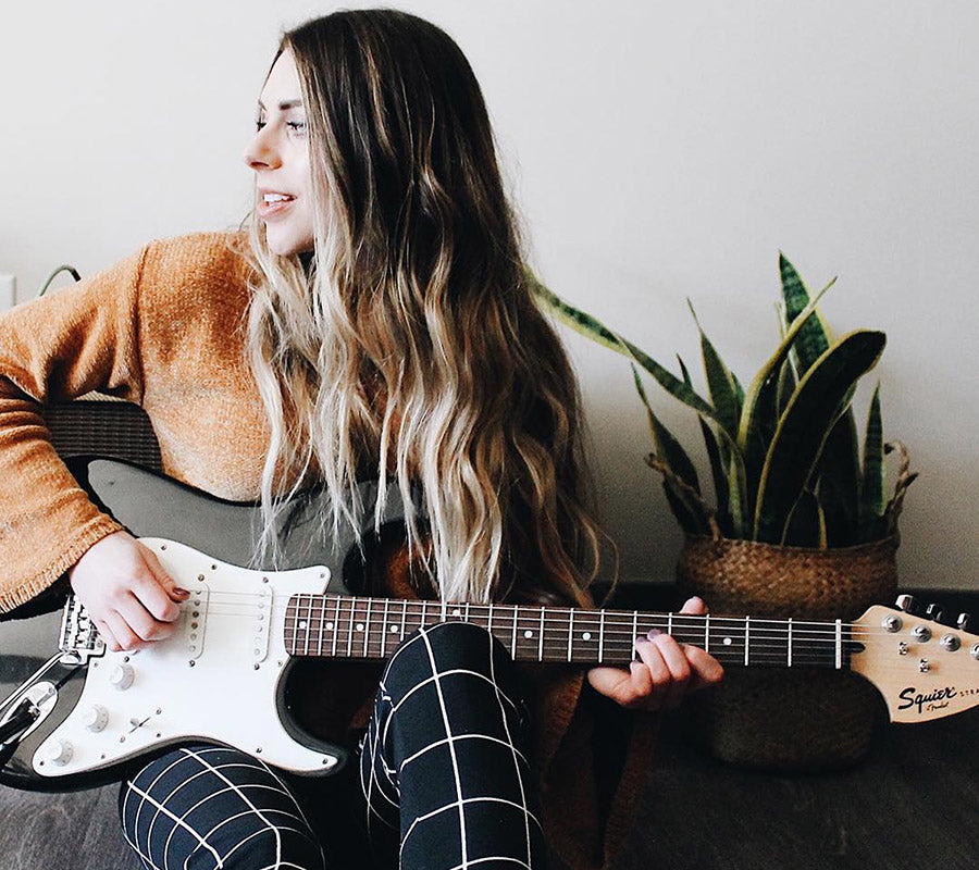 Artist and online course instructor Hailey Powers playing her modified Squier Stratocaster loaded with a set of “the Triple Shots”.